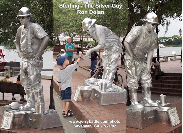 Savannah, GA - July 21, 2002 On a week-end trip to Savannah we encountered a unique individual. I usually don't pay a lot of attention to street entertainers but this one was different from anyone I had previously seen. Originally from St. Augustine, Florida, Ron Dolan has been entertaining both residents and visitors in Savannah for some five years. See Sterling, the living statue, on River Street - where else would you go in Savannah?